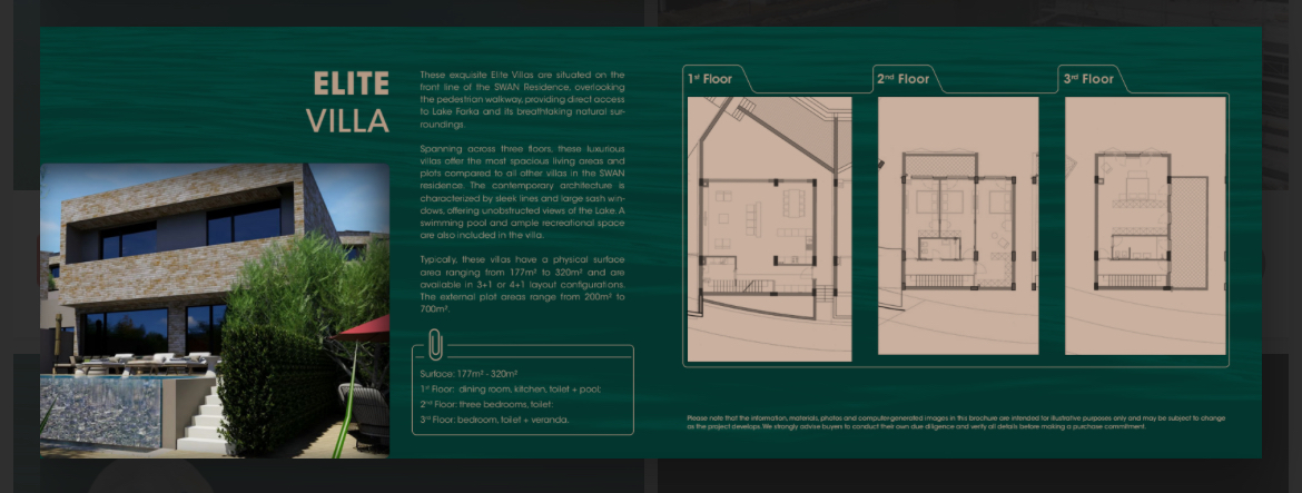 Spanning across three floors, these luxurious villas offer the most spacious living areas and plots compared to all other villas in the SWAN residence. The contemporary architecture is characterized by sleek lines and large sash windows, offering unobstructed views of the Lake.