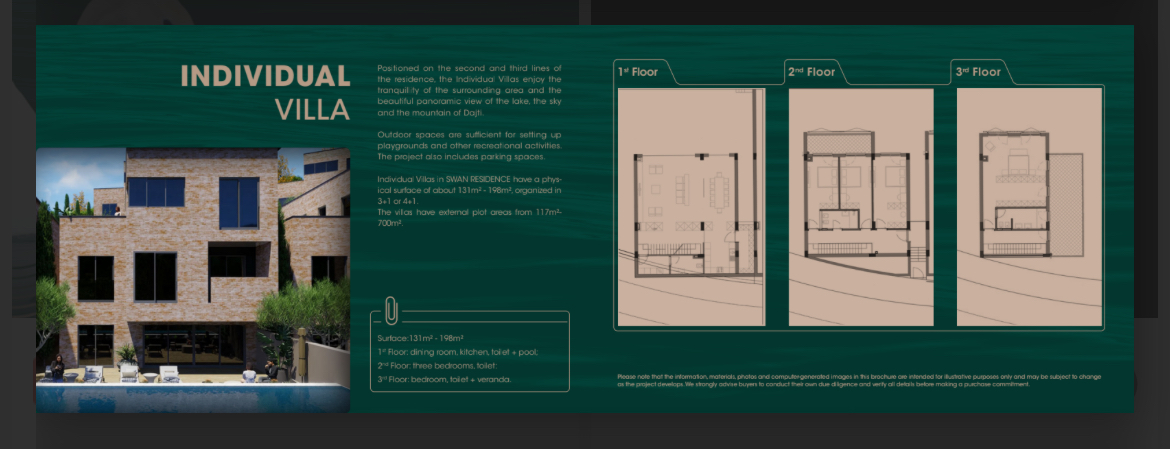 Individual Villas in SWAN RESIDENCE have a physical surface of about 131m2 – 198m2, organized in 3+1 or 4+1. The villas have external plot areas from 117m2-700m2.
